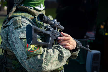 real modern soldier of russian army in the uniform with weapon