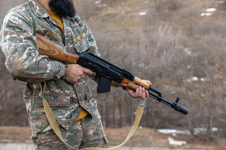 The soldier in the performance of tasks in camouflage and protective gloves holding a gun. War Zone.