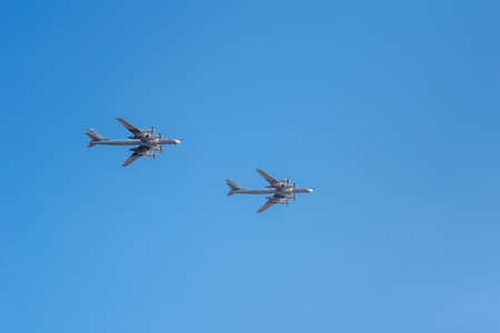MOSCOW, RUSSIA - MAY 4, 2018: A group of airplane. Rehearsal of parade devoted to May 9, Victory Day in World War II. May 4, 2018 in Moscow.