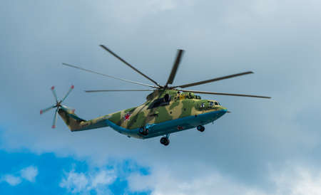 Army aviation, air transport. Helicopter flight against a cloudy sky. View from below. Toning. Copy space.