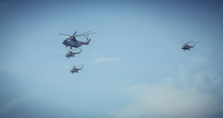 May 7, 2021, Moscow, Russia. Russian heavy Mi-26 helicopters over Red Square in Moscow.