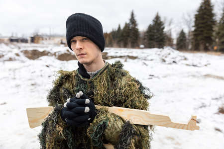A soldier in camouflage sniper holding a sniper rifle Vintorez. vertical composition