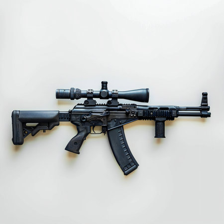 Black assault rifle on a white background. View from above. Flat lay.