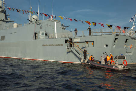 Russia, St. Petersburg, 27 July 2019: The warship Admiral of fleet Kasatonov in the Neva River before the holiday of the Russian Navy at sunny day, captain and sailors
