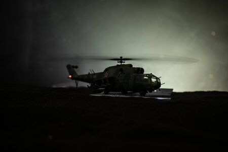 Silhouette of military helicopter ready to fly from conflict zone. Decorated night footage with helicopter starting in desert with foggy toned backlit. Selective focus. War concept