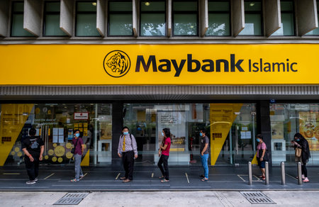 KUALA LUMPUR, MALAYSIA - MAY 06, 2020: People wearing a face mask while lining up with social distancing at the bank. Malaysia Coronavirus disease 2019 (COVID-19) outbreak.