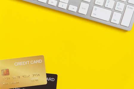 top view credit or debit card and mobile phone concept of online payments and shopping