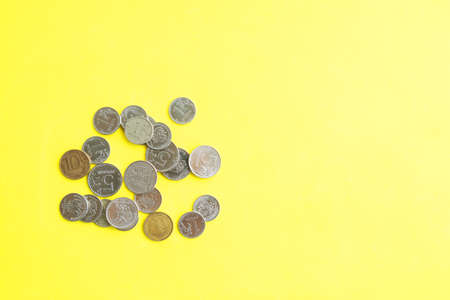 Concept of saving money, coins and banknotes isolated on yellow background