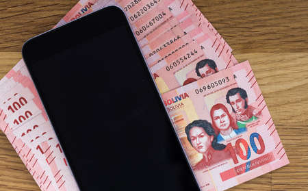 Bolivian currency, One hundred Bolivianos banknotes lying together with a mobile phone