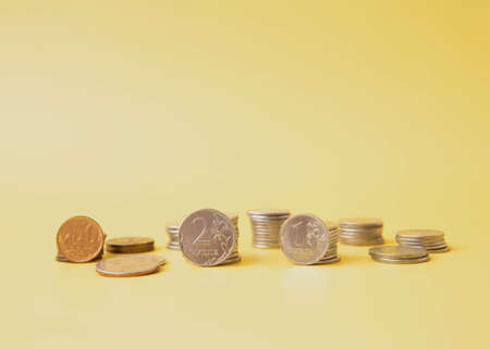 Russian rubles are stacked on a yellow background