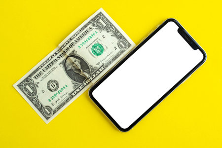 Dollars and smartphone. Denominations of 100 dollars are on a black background on them, next to them is a smartphone with a white screen. Top view and angle. Macro smartphone and dollars