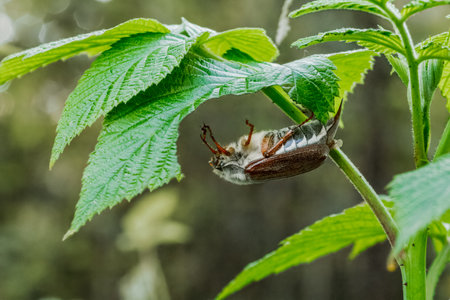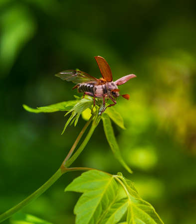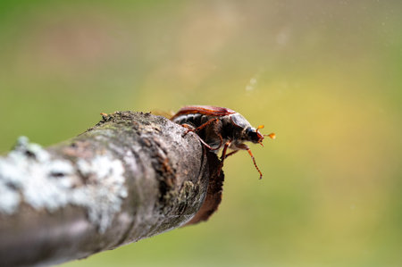 Cockchafer or May bug (Melolontha melolontha) is ready to fly from the tree branch, close-up. Green summer forest blurred in bokeh. Insect, zoology, entomology, environmental conservation, nature