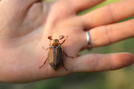 A beautiful European chafer poses on a human hand during a beautiful summer day by the lake