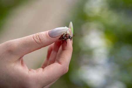 cockchafer in the hands of a young girl with a bright manicure, soft green background. may beetle melolontha melolontha. Insect life, spring background, copy space for text.