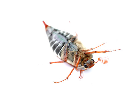 Dead CHRABLE COMMON COCKCHAFER lying on the back on the spring terrace