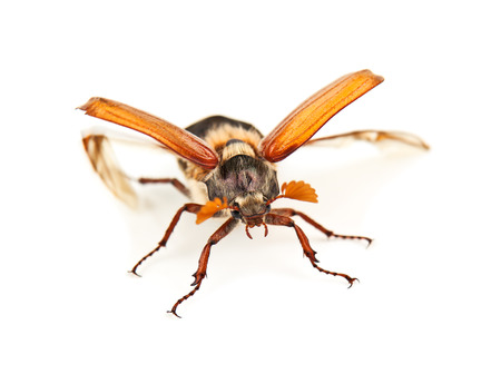 May bug (Melolontha melolontha) is ready to fly from the tree branch, close up. Spring time