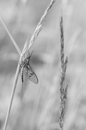 Adult mayfly, ephemera danica, resting on a blade of grass