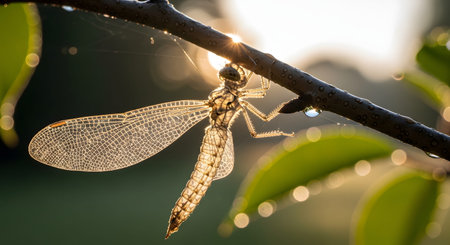 The translucent exoskeleton of a dragonfly clings to a tree branch, illuminated by the golden backlight of the setting sun. The macro shot details the intricate wing cases and the emptiness of the shell after metamorphosis.