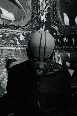 Horror faces and Happy Halloween. Make up and scary concept for man. Halloween holiday celebration - Man demon on black background.