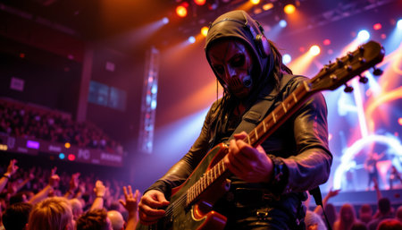 Masked guitarist playing electric guitar on stage with colorful lights and enthusiastic crowd enjoying live concert