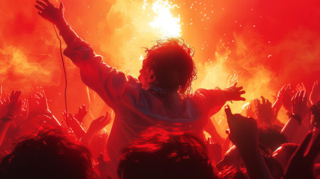 Silhouette of a singer in the spotlight, arms wide open, with stage lights creating a powerful and emotional scene