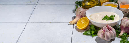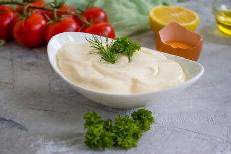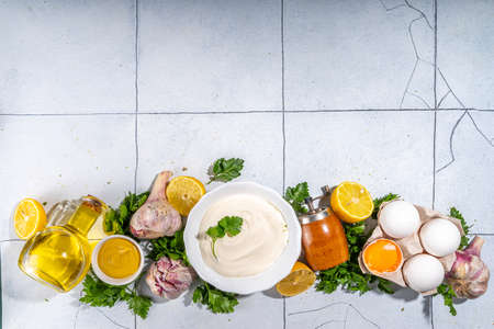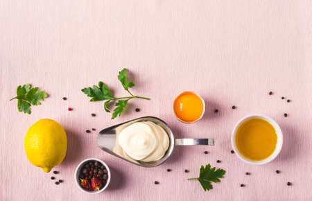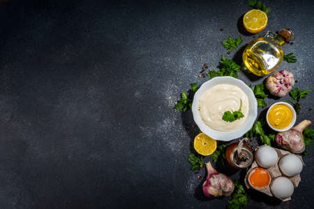Homemade mayonnaise sauce. Bowl of mayonnaise with fresh ingredients top view copy space