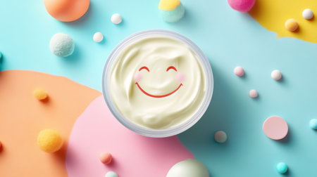 Smiling face on creamy yogurt with colorful pastel decorations, cheerful concept