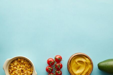 Top view of corn, mustard with avocado and cherry tomatoes on blue background with copy space