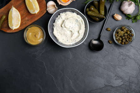 Tasty tartar sauce and ingredients on black table, flat lay. Space for text