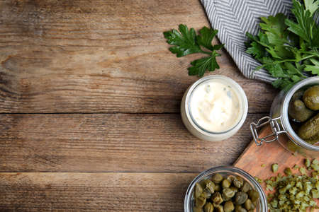 Tasty tartar sauce and ingredients on wooden table, flat lay. Space for text