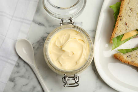 Jar of delicious mayonnaise near fresh sandwiches on white marble table, flat lay