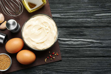 Glass bowl with fresh mayonnaise and ingredients on black wooden table, top view. Space for text