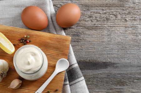Fresh mayonnaise sauce in glass jar and ingredients on wooden table, flat lay. Space for text