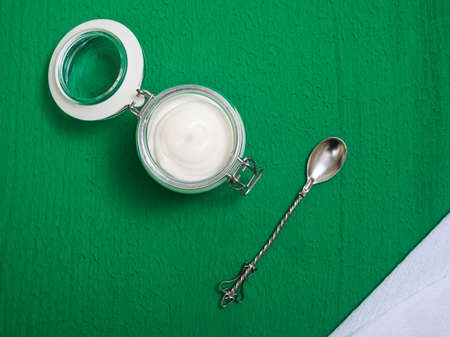 homemade greek yogurt in glass jar and vintage spoon on green background, top view