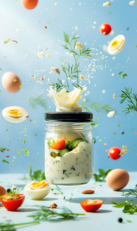 Floating Eggs and Vegetables in a Jar Full of Food A Surreal Culinary Composition on Dark Background