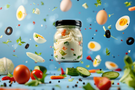 Fresh and healthy mayonnaise with colorful assortment of vegetables and fruit on blue background