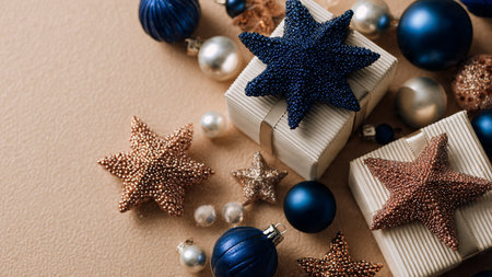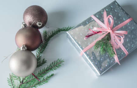 Christmas composition with present and decorations in blue and silver colors
