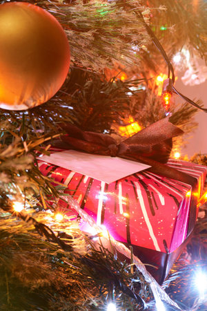christmas tree detail with red gift box brown ribbon on it