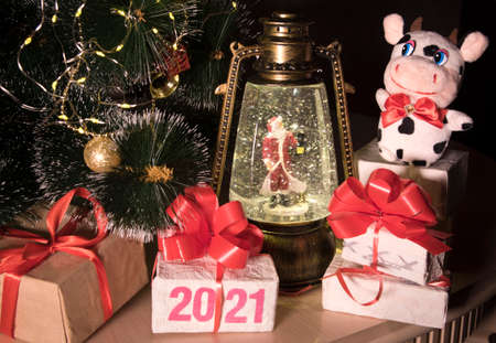 2021 figures on box. Christmas gift boxes with red ribbon, white cow bull toy, New Year tree with decorations, magic lantern, santa on table in room.