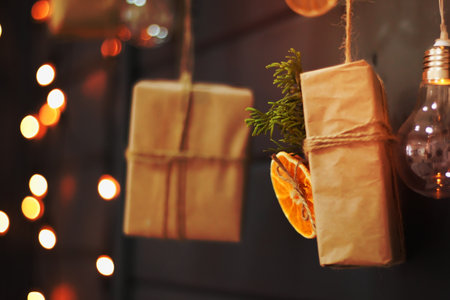 Merry Christmas and Happy Holidays. Preparation of Christmas gifts. Craft paper, gifts, Christmas decorations. Christmas family traditions