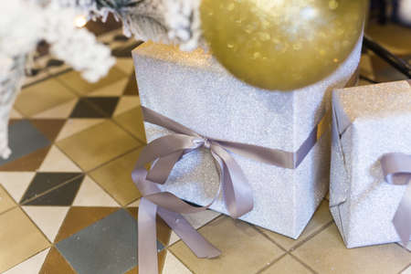 Bright silver gifts in packaging and with bows under the Christmas tree on the floor. Christmas decorations. Christmas background. Beautiful holiday decorated room with Christmas tree with presents under it.
