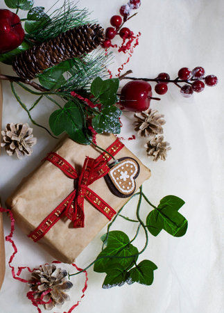 Christmas festive card concept with gift box decorated with red ribbon, balls, cones and fir tree branch on white background with copy space