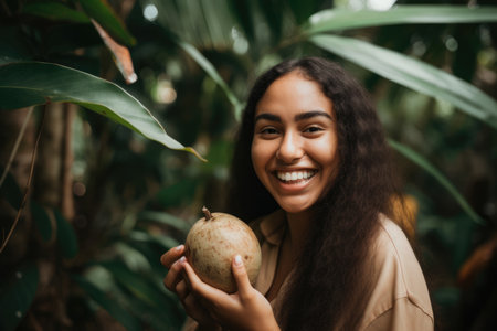 Portrait of a woman holding a ripe sapodilla fruit with a bright smile on her face, surrounded by lush greenery in a tropical garden