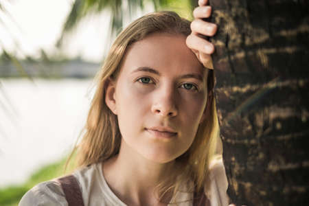 Close-up portrait of beautiful caucasian woman with blond hair near palm tree. Healthy skin, make-up free, looks directly at camera. High quality