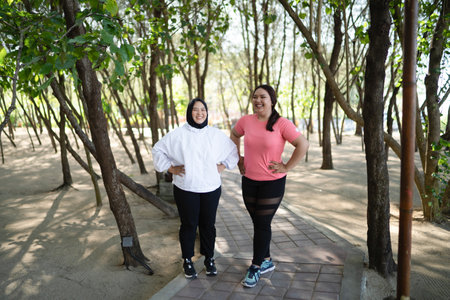 happy asian sporty women in sportswear standing with arms at hip pose