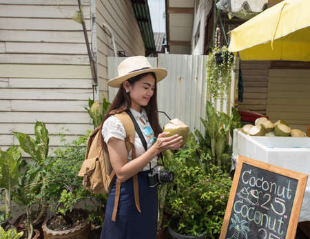 Young Asian women tourist holding coconut and traveling at outdoor local street market in Bangkok Thailand on vacations