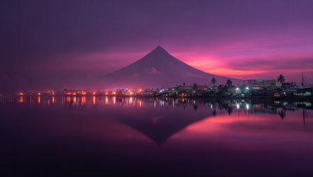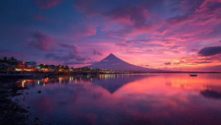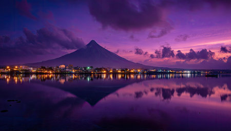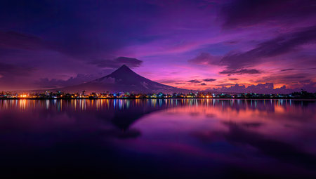 A stunning landscape features a mountain silhouetted against a vibrant purple and pink sky. Calm water reflects the colorful sky and the lights from a distant town, creating a symmetrical composition. This image could be used for various purposes, including editorial and marketing materials.