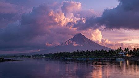 Great Mayon Volcano on Luzon Island Panoramic View. Oriental Mountain Peak and Beautiful Color Sky Sunset. Photography on Ocean with Ship Boat. Philippines Seaside Ecoregion Scenery