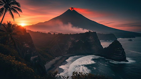 An aerial view presents a volcano silhouette against a vibrant sunset sky. The scene shows dark cliffs meeting a dynamic ocean, with waves breaking on the shore. Palm trees frame the foreground. The image could be suitable for travel promotion, environmental projects, or artistic display.