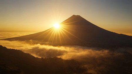 Mt. Fuji in the clouds at sunrise. View from above.